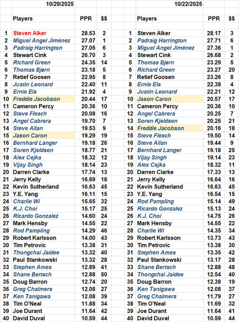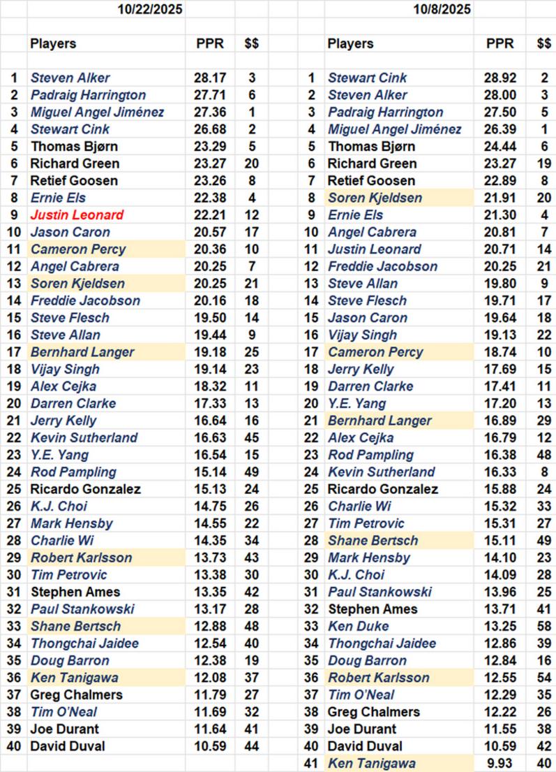 In the chart: Blue bold italic indicates change from last week. Shaded with yellow indicates largest changes. Orange is for dropped players and Green is for returning or entering players. Red is for winners. $$ column of numbers reflects position on Champions Tour money list.